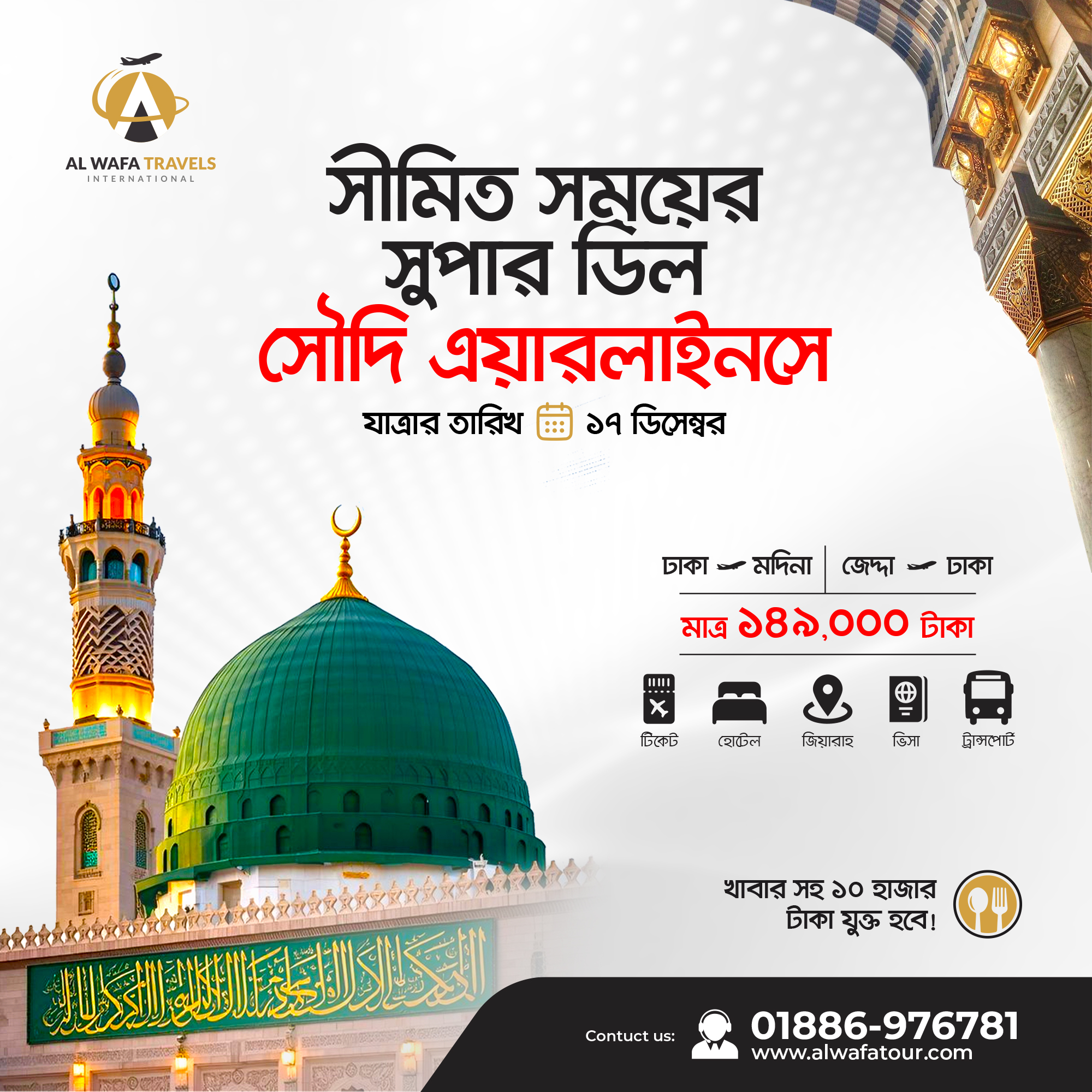 পবিত্র হজ ও উমরাহ মুসলিম জীবনধারার এক বিশেষ ইবাদত, যা আত্মার পবিত্রতা, ধৈর্য, তাওয়াক্কুল এবং আল্লাহর নৈকট্য অর্জনের পথ তৈরি করে। এই মহিমান্বিত সফরকে আরও সহজ, নিরাপদ ও সুসংগঠিত করতে প্রয়োজন একজন বিশ্বস্ত সঙ্গী—আর সেই দায়িত্বই নিষ্ঠার সঙ্গে পালন করছে Alwafatour।