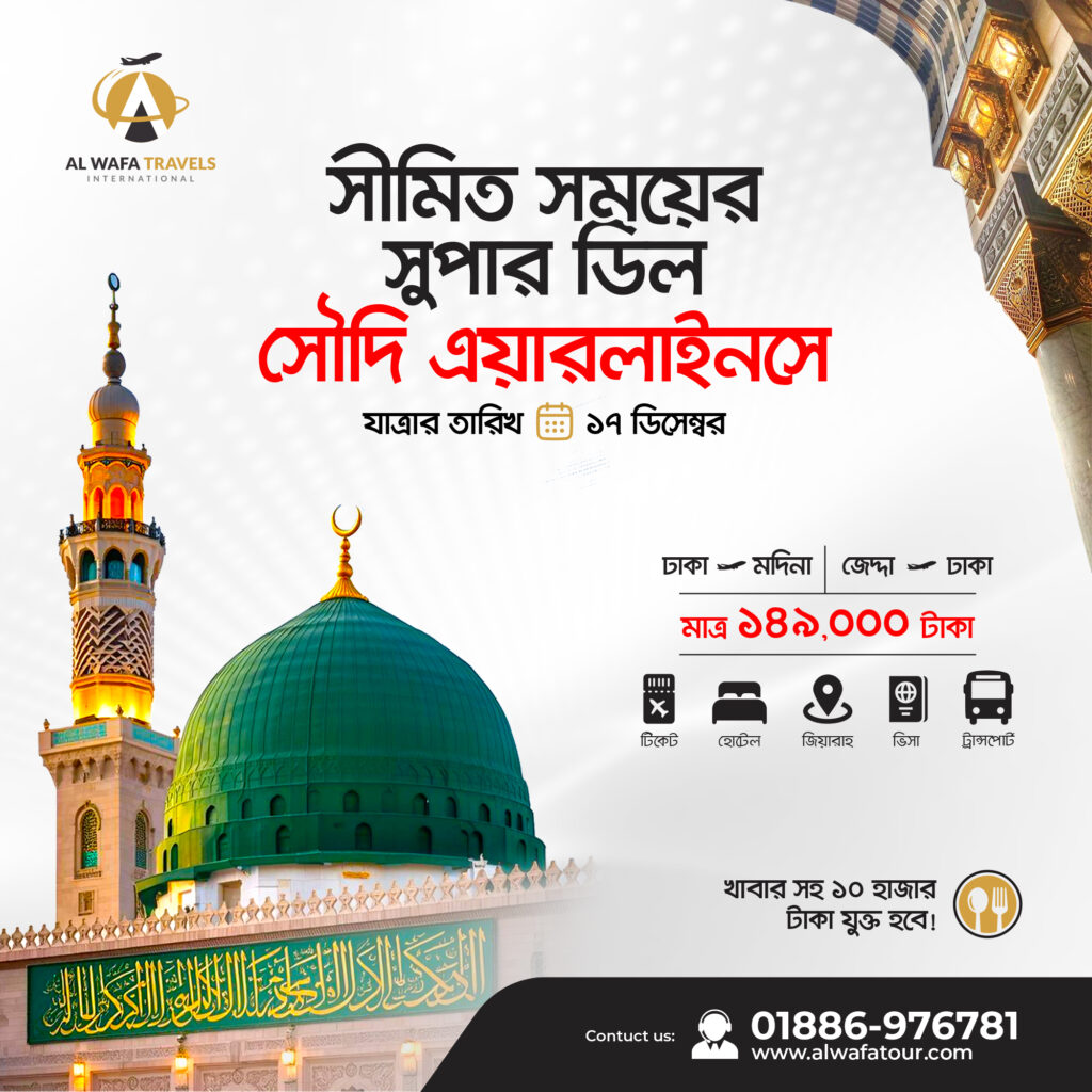 আল ওয়াফা ট্রাভেলস ইন্টারন্যাশনালের পক্ষ থেকে পবিত্র মক্কা-মদিনার বরকতময় সফরের জন্য এই বছরের সীমিত সময়ের সর্বশেষ সুপার ডিল ঘোষণা করা হলো।এটি আপনার জীবনের একটি অভূতপূর্ব সুযোগ, যেখানে আপনি এবং আপনার প্রিয়জনরা সৌদি এয়ারলাইন্সের সুবিধাজনক ঢাকা-মদিনা এবং জেদ্দা-ঢাকা রুটে অংশগ্রহণ করতে পারবেন।