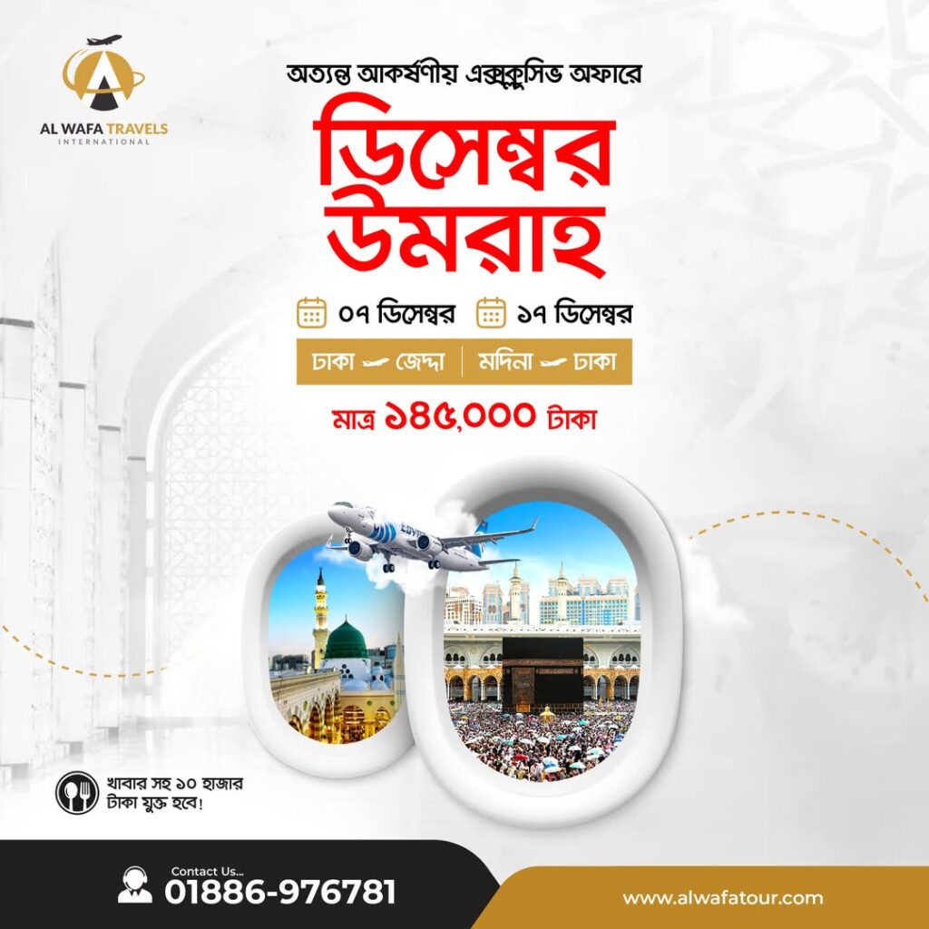 আল ওয়াফা ট্রাভেলস ইন্টারন্যাশনালের সঙ্গে পবিত্র ডিসেম্বরে উমরাহ করুন, যেখানে প্রতিটি মুহূর্ত হবে স্বাচ্ছন্দ্যময়, নিরাপদ এবং অর্থবহ। আমাদের অভিজ্ঞ গাইড এবং সুপরিকল্পিত ব্যবস্থাপনা নিশ্চিত করবে যে আপনার সফর হবে শান্তিপূর্ণ, সুবিধাজনক এবং স্মরণীয়। এখনই আপনার স্থান নিশ্চিত করুন এবং জীবনের অন্যতম মহৎ ইবাদতের অংশ হোন। ঘটে, সেজন্য প্রতিটি ধাপেই আমরা রাখি সর্বোচ্চ যত্ন ও সততা। পবিত্র এই যাত্রাকে করুন স্মরণীয় ও হৃদয়ছোঁয়া অভিজ্ঞতায় পরিণত,সহজে, নিশ্চিন্তে, বিশ্বস্ত সহায়তায়।