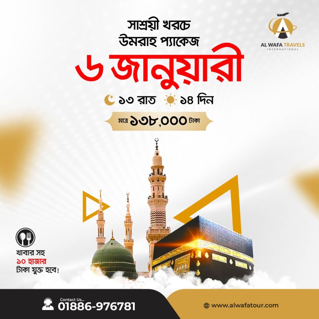 পবিত্র বাইতুল্লাহ সফরের স্বপ্ন পূরণের সুবর্ণ সুযোগ!আসন্ন জানুয়ারি ২০২৬-এ আল্লাহর ঘরে হাজিরা দেওয়ার উদ্দেশ্যে আল ওয়াফা ট্রাভেলস ইন্টারন্যাশনাল নিয়ে এসেছে সাশ্রয়ী খরচে, স্ট্যান্ডার্ড মানের ও সম্পূর্ণ আরামদায়ক উমরাহ প্যাকেজ।আমাদের প্রতিটি হজ ও উমরাহ কাফেলা পরিচালিত হয় বিজ্ঞ আলিম ও অভিজ্ঞ গাইডদের তত্ত্বাবধানে। ফলে আমাদের সম্মানিত মেহমানগণ অত্যন্ত সহজ, নির্ভুল ও বিশুদ্ধভাবে তাদের পবিত্র হজ ও উমরাহর সব কার্যক্রম সম্পন্ন করতে পারেন।আল ওয়াফা ট্রাভেলস ইন্টারন্যাশনাল বিশ্বস্ততার সাথে নিরাপদ বাইতুল্লাহ সফরের অনন্য সহযাত্রী।